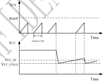 當(dāng)VCC電壓超過設(shè)定的過壓閾值(通常為55V至59.5V)時,LP8776AH會觸發(fā)過壓保護(hù)機(jī)制。此時,芯片將停止輸出PWM信號,防止因過高的電壓對芯片內(nèi)部電路和外部設(shè)備造成損害。過壓保護(hù)功能為芯片提供了一個安全的工作電壓范圍,確保其在電源電壓異常升高時能夠及時采取保護(hù)措施。
