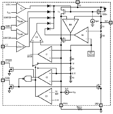 由于采用了內(nèi)部PMOSFET架構(gòu),加上防倒充電路,所以不需要外部隔離二極管。熱反饋可對(duì)充電電流進(jìn)行自動(dòng)調(diào)節(jié),以便在大功率操作或高環(huán)境溫度條件下對(duì)芯片溫度加以限制。充電電壓固定于 4.2V,而充電電流可通過一個(gè)電阻器進(jìn)行外部設(shè)置。當(dāng)充電電流在達(dá)到最終浮充電壓之后降至設(shè)定值 1/10 時(shí),TC4056A 將自動(dòng)終止充循環(huán)。內(nèi)部框架圖如下所示