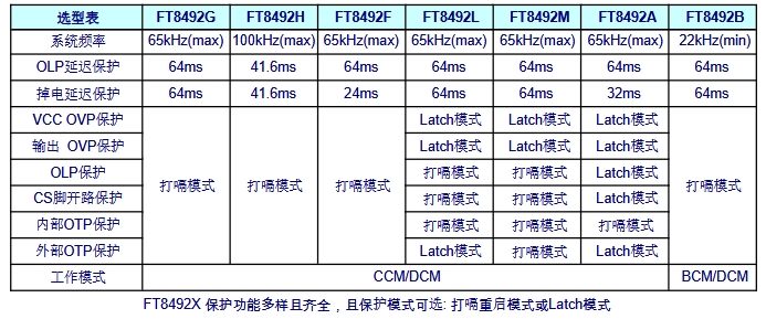 在保護功能方面,FT8492系列芯片提供了多種保護機制,且保護模式可選。例如,其過載保護(OLP)和輸出過壓保護(OVP)可選擇打嗝模式或Latch模式,以適應不同的應用場景和設計需求。打嗝模式在故障發生時會自動重啟芯片,而Latch模式則會鎖定故障狀態,直到故障排除后重新啟動。這種靈活的保護模式選擇,為設計人員提供了更大的靈活性,能夠根據具體應用需求優化保護策略。