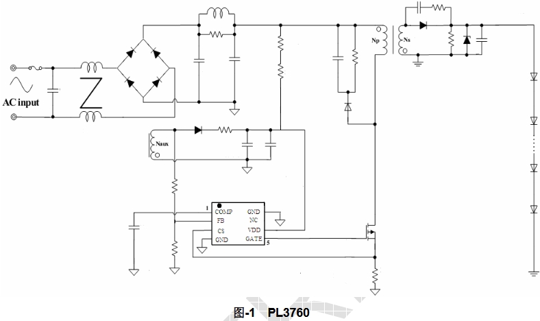 PL3760內部集成了逐周期限流功能,通過功率管源極與地之間的電阻進行電流采樣。內部的LEB(前沿消隱)電路可以有效消除信號毛刺,減少外部元件數量,提高系統的可靠性。