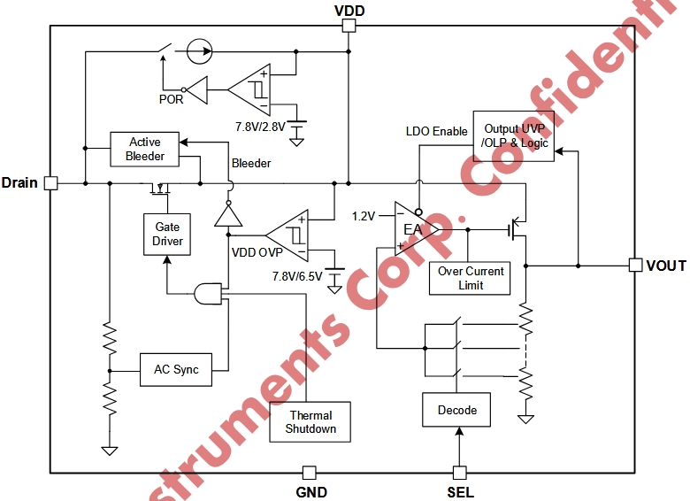 | 5,6,7,8 | Drain | 內(nèi)部功率MOSFET漏極引腳。在電壓處于充電窗口內(nèi)時(shí)提供能量。 |