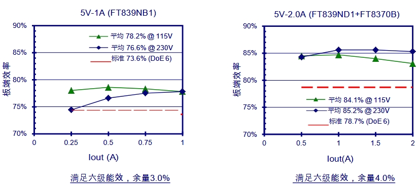 FT839xx/FT8393xx系列芯片在設(shè)計上充分考慮了能效優(yōu)化,能夠輕松滿足DoE和CoC六級能效標(biāo)準(zhǔn)。以FT839NB1為例,在115V和230V輸入電壓下,其平均效率分別達到了78.2%和76.6%,遠(yuǎn)高于標(biāo)準(zhǔn)要求的73.6%,且余量達到了3.0%。這意味著在實際使用中,該芯片不僅能夠高效地將電能轉(zhuǎn)換為設(shè)備所需的能量,還能在不同負(fù)載條件下保持穩(wěn)定的能效表現(xiàn)。