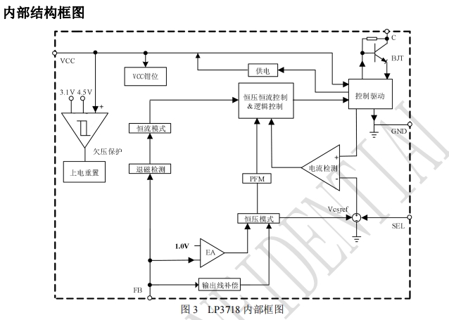 在設計上,LP3718BSL采用了極簡化的外圍電路。它內置啟動電路,無需外部啟動電阻,同時采用自供電技術,取消了輔助繞組VCC供電二極管。這些設計不僅降低了系統成本,還提高了系統的可靠性和效率。內部框架圖如下所示~