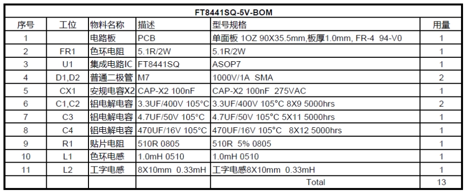 以下是該5V250mA開關(guān)電源方案的主要物料清單: