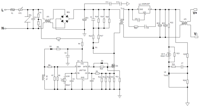 1. 原邊電路:LP8773S直接驅動MOSFET,無需光耦反饋,節省1顆光耦+TL431。