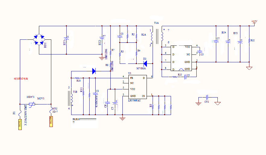下圖展示了一個(gè)典型的12V3A電源PSR方案,使用LP3799FAC芯片作為核心組件。