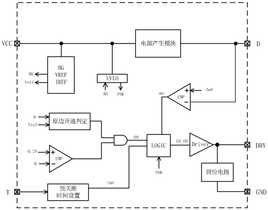 這些模塊協同工作,實現了從電源輸入到同步整流MOS管驅動的完整控制流程。其中,電源產生模塊為芯片提供穩定的VCC供電;原邊開通判定模塊通過檢測漏極電壓的變化率和幅度,精準判斷同步整流管的開通時刻;鉗位電路則確保VCC電壓不會超過安全范圍;預關斷時間設置模塊通過T腳外接電阻實現死區時間的靈活調整;驅動邏輯模塊則根據各模塊的信號輸出,精確控制DRV腳的驅動信號,實現同步整流MOS管的高效導通與關斷。