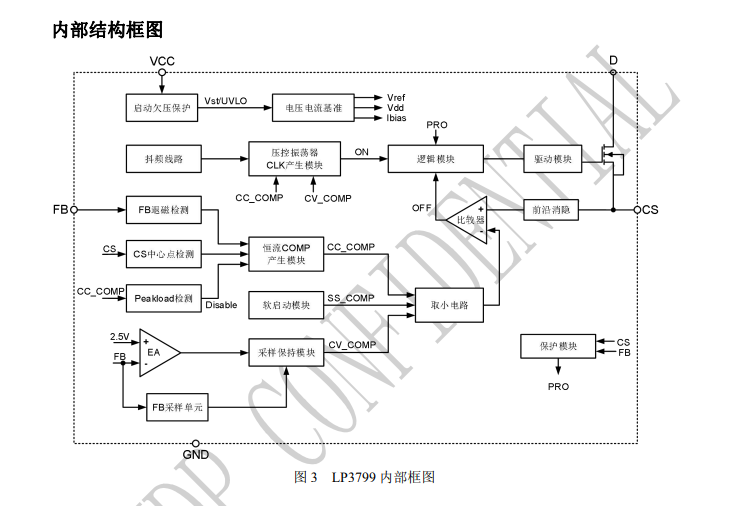 LP3799BAB 內(nèi)部集成大于 650V 高壓功率管,采用特有的檢測方式和算法,系統(tǒng)可以工作在恒壓和恒流兩種狀態(tài)。