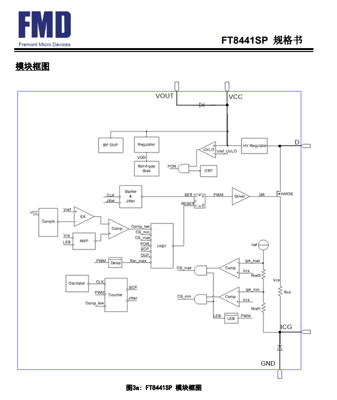 FT8441SP還集成了其他功能:VCC欠壓保護(hù)(UVLO)、VCC欠壓保護(hù)(UVLO)、VCC過壓保護(hù)(OVP)、過溫保護(hù)(OTP)、逐周期過流保護(hù)(OCP)、輸出短路保護(hù)(SCP),從而保證了系統(tǒng)的可靠性。