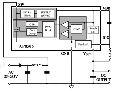 AP8506基于高壓同步整流架構,集成PFM控制器以及650V高可靠性MOSFET,用于外圍元器件極精簡的小功率非隔離開關電源。AP8506內置730V高壓啟動,實現系統快速啟動、超低待機功能。該芯片提供了完整的智能化保護功能,包括過流保護,欠壓保護,過溫保護。另外AP8506具有優異的EMI特性。