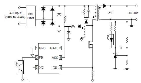 芯片通過(guò)對(duì)輸出采樣并反饋到光耦獲得高精度的恒壓輸出。內(nèi)置的斜串補(bǔ)償電路確保了峰值電流??刂频姆€(wěn)定性。內(nèi)部集成的頻率抖動(dòng)功能可以改善EMC.降低EMI濾波成本。