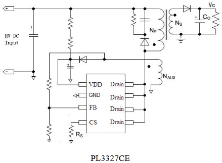 PL3327CE 是一系列高效率、高集成度、原邊調(diào)節(jié)的 PWM功率開(kāi)關(guān),其主要應(yīng)用于小于 18W 的 AC/DC 反激式開(kāi)關(guān)電源。PL3327C 通過(guò)去除光耦以及次級(jí)控制電路,簡(jiǎn)化了充電器/適配器等傳統(tǒng)的恒流/恒壓的設(shè)計(jì),從而實(shí)現(xiàn)高精度的電壓和電流調(diào)節(jié),復(fù)合模式的應(yīng)用使得芯片能夠?qū)崿F(xiàn)低靜態(tài)功耗、低音頻噪音、高效率。而且高集成的功率 MOSFET 能夠降低外部 PCB的面積以及系統(tǒng)的成本。PL3327C 同時(shí)具有多種保護(hù)功能:逐周期峰值電流檢測(cè)、欠壓保護(hù)、過(guò)壓保護(hù)等。