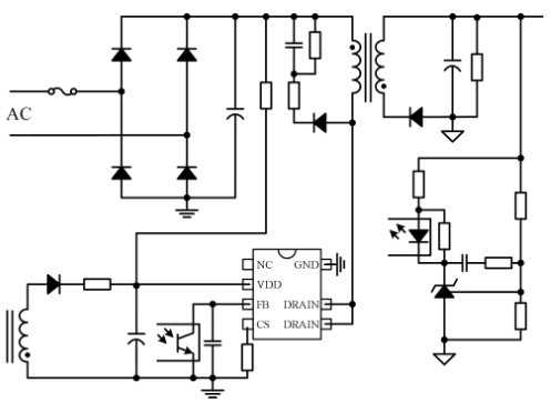 芯片通過對輸出采樣并反饋到光耦獲得高精度的恒壓輸出。內置的斜率補償電路確保了峰值電流模控制的穩定性。內部集成的頻率抖動功能可以改善EMC,降低EMI濾波成本。