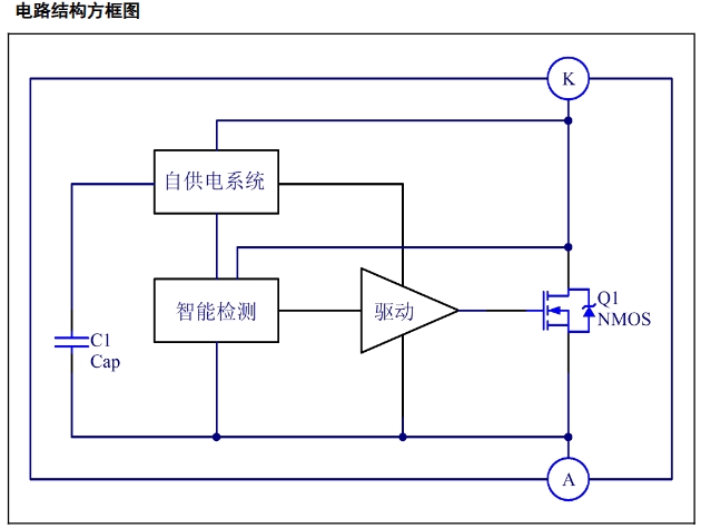 DK5V120R15H是一款簡單高效率的同步整流芯片,只有A,K兩個引腳,分別對應肖特基二極管的PN管腳。芯片內部集成了120V功率NMOS管,可以大幅降低二極管導通損耗,提高整機效率,取代或替換目前市場上等規的肖特基整流二極管。DK5V120R15S采用SM-7封裝(兼容TO-277封裝)。內部框架圖如下
