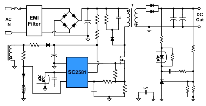 SC2581 是一款電流型多模式 PWM 電源控制芯片,避免了音頻噪音。SC2581 采用多模式的效率均衡控制技術,提升了系統效率;峰值功率控制技術提高了系統的過載性能。SC2581 提供了一系列完整的保護功能,如兩級 OCP、OLP、OSP、OTP、輸出 OVP 等。