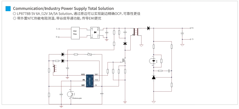 對于12W至24W的低功率應用,SSR MOS Combo提供了一種高效的解決方案。LP8728ML、LP8728MD和LP8728AD/BD系列PWM控制器,配合LP15R060SD SR控制器,能夠提供穩(wěn)定的12V輸出,電流從1A到2A不等。這些組合特別適合于需要穩(wěn)定低壓電源的通信設備。