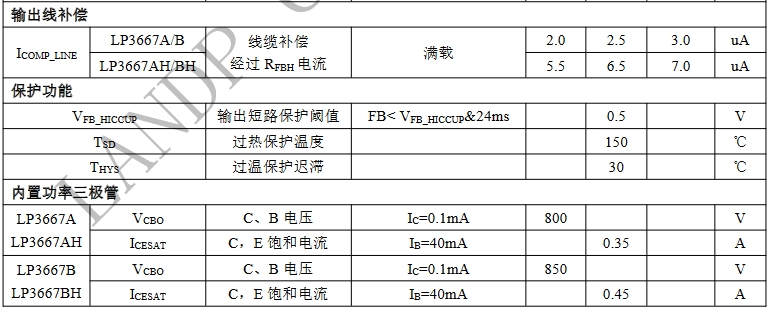 輸出線補償:LP3667BH具有6%的固定比例線纜補償,而LP3667B則為2%。這一差異可能會影響到輸出電壓的精確度和穩(wěn)定性,尤其是在長距離傳輸中。