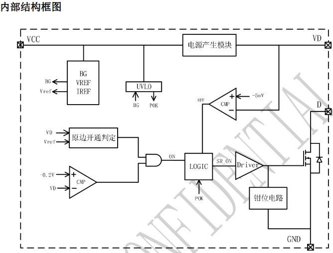 LP15R060S的內(nèi)部結(jié)構(gòu)框圖揭示了其復(fù)雜的內(nèi)部電路設(shè)計(jì)。電源產(chǎn)生模塊、BG(帶隙參考)、VREF(參考電壓)、IREF(參考電流)等關(guān)鍵部件共同工作,確保芯片的穩(wěn)定運(yùn)行。此外,芯片還包含原邊開(kāi)通判定、鉗位電路、比較器等,這些部件協(xié)同工作,實(shí)現(xiàn)對(duì)同步整流管的精確控制。