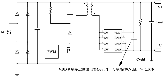 寬電壓范圍:芯片兼容DCM(斷續(xù)電流模式)或QR(準(zhǔn)諧振模式)反激開(kāi)關(guān),適用于不同的電源設(shè)計(jì)需求。