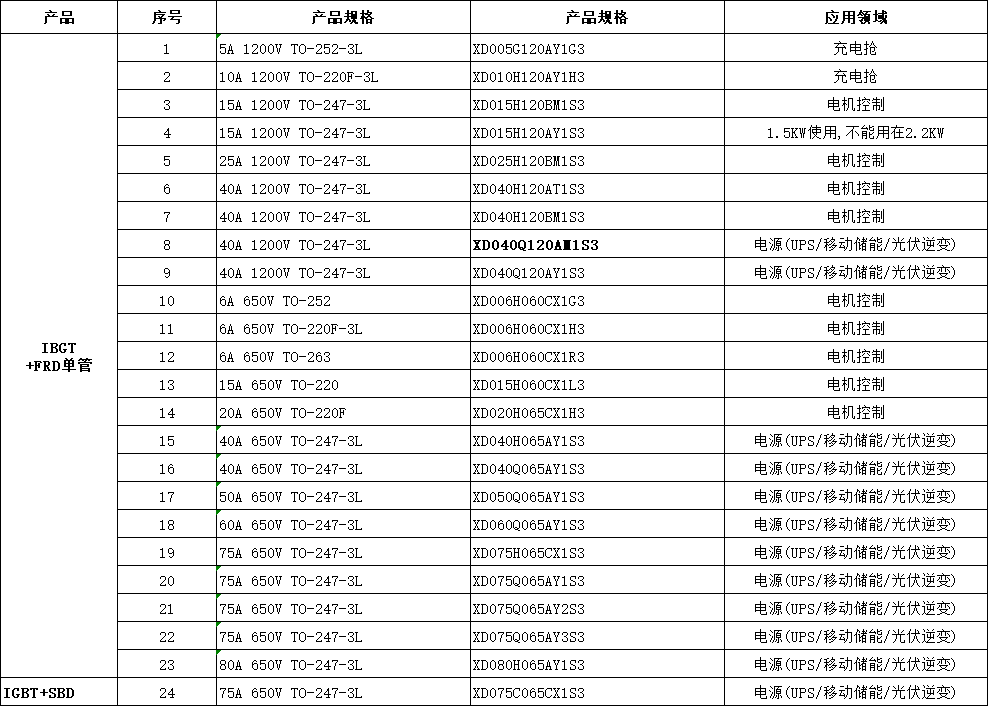 芯達茂XD040Q120AM1S3國產IBGT +FRD單管 40A 1200V TO-247-3L, 應用:電源(UPS/移動儲能/光伏逆變)