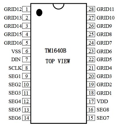 TM1640B芯片通常采用DIP或SOIC封裝,以下是其主要引腳的功能描述: